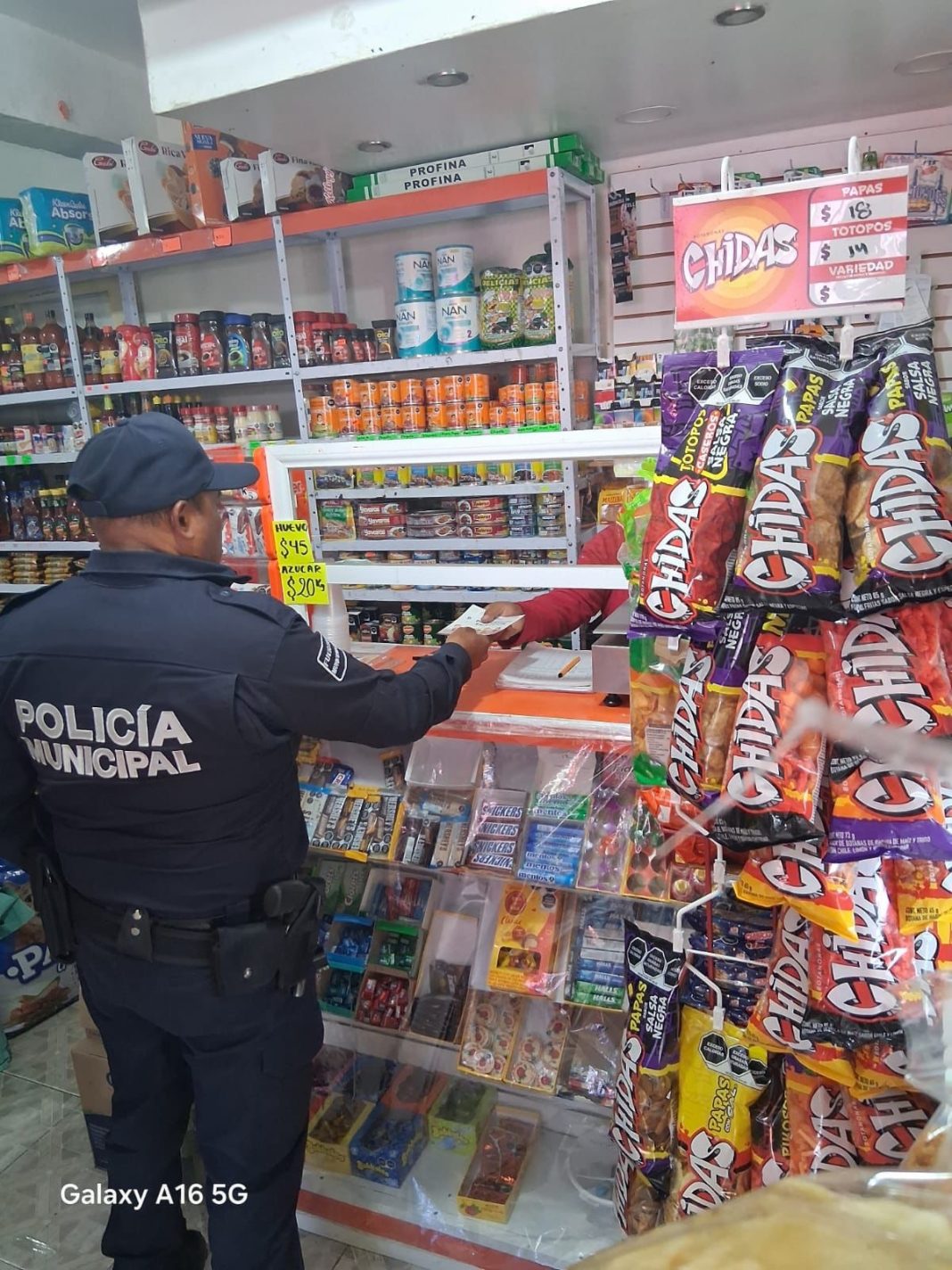 Durante estas actividades, personal de la Dirección de Seguridad Pública, a cargo de Alejandro Reyes Soto, realiza la difusión de números de emergencia y comparte recomendaciones para el comercio seguro, con el propósito de prevenir incidentes y fomentar la colaboración ciudadana.