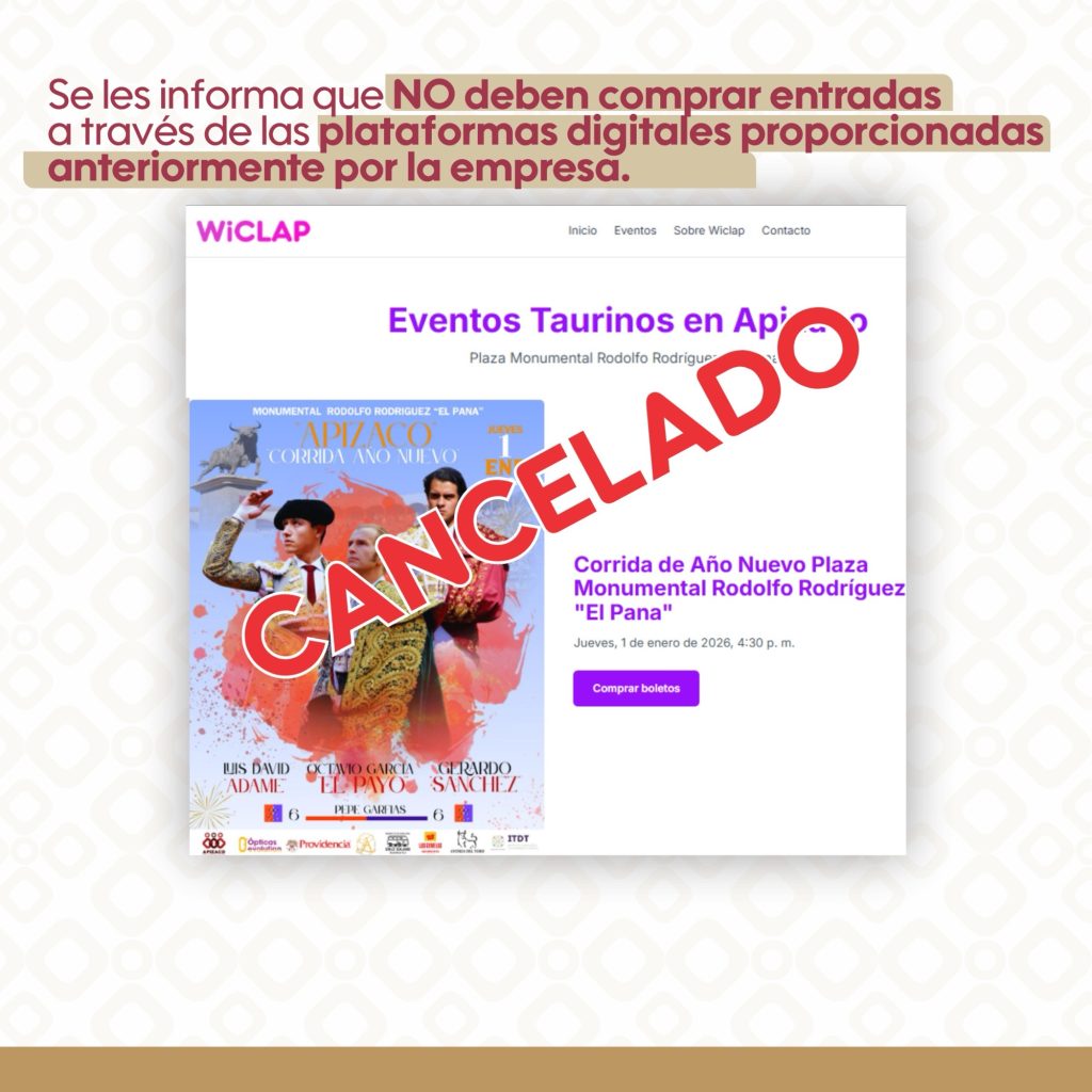 Asimismo, se informa de manera muy importante a la ciudadanía que no deberán adquirirse boletos a través de los enlaces o plataformas previamente proporcionados por la empresa organizadora, ya que el festejo taurino que organizará el Gobierno de Apizaco será totalmente GRATUITO, reafirmando así su compromiso con las tradiciones, la transparencia y el acceso del pueblo a sus expresiones culturales.