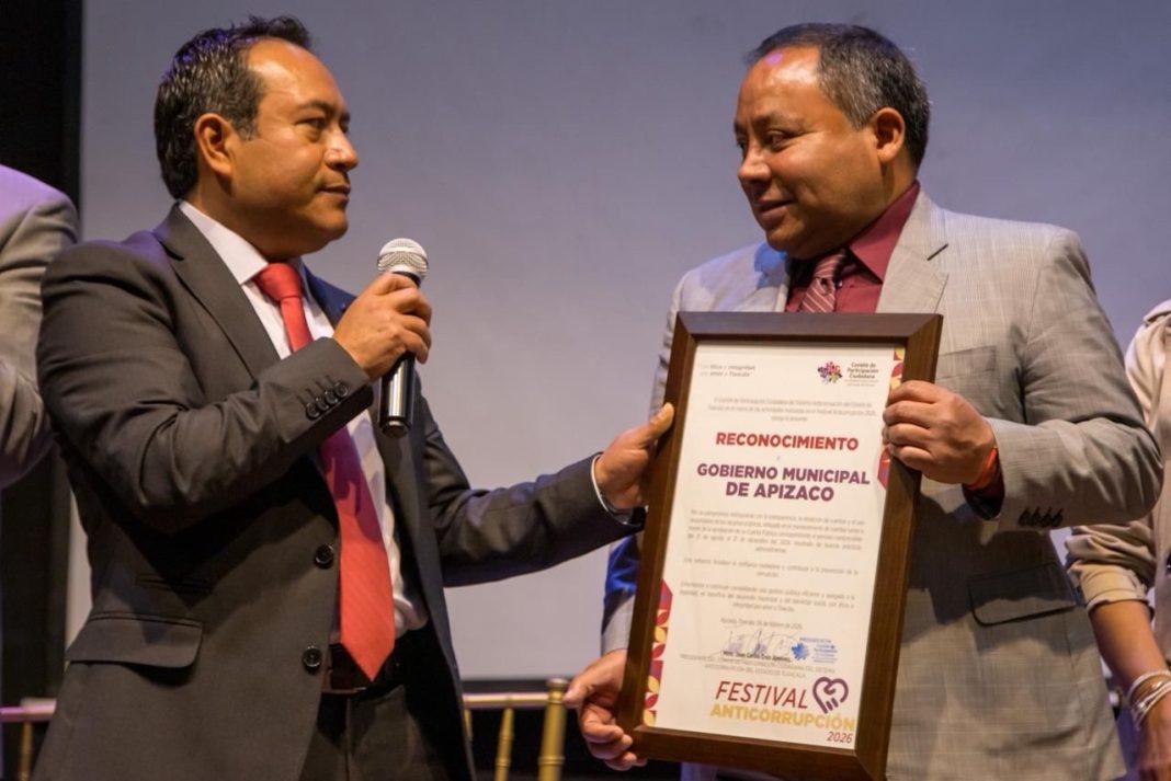 Al término de su intervención, Juan Carlos Cruz Jiménez, presidente del Comité de Participación Ciudadana del Sistema Anticorrupción del Estado de Tlaxcala, entregó el reconocimiento oficial al Gobierno Municipal de Apizaco, destacando la importancia de reconocer cuando las cosas se hacen bien y de fortalecer la confianza ciudadana a través de buenas prácticas administrativas.