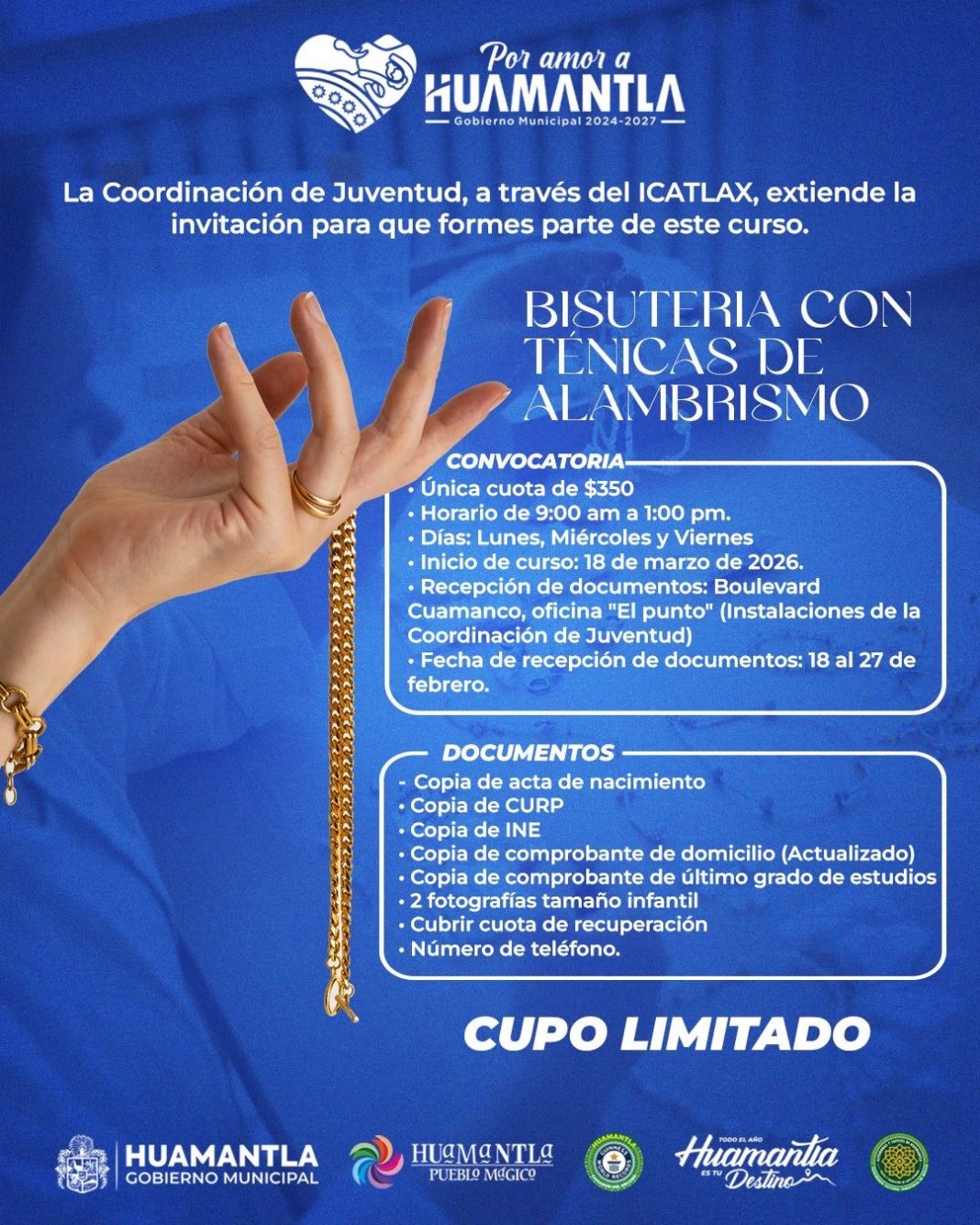 A través de la Coordinación de Juventud y en colaboración con el Instituto de Capacitación para el Trabajo del Estado de Tlaxcala (ICATLAX), el Gobierno Municipal de Huamantla invita a la ciudadanía a participar en el curso “Bisutería con Técnicas de Alambrismo”, una oportunidad para desarrollar habilidades creativas y fortalecer el autoempleo.