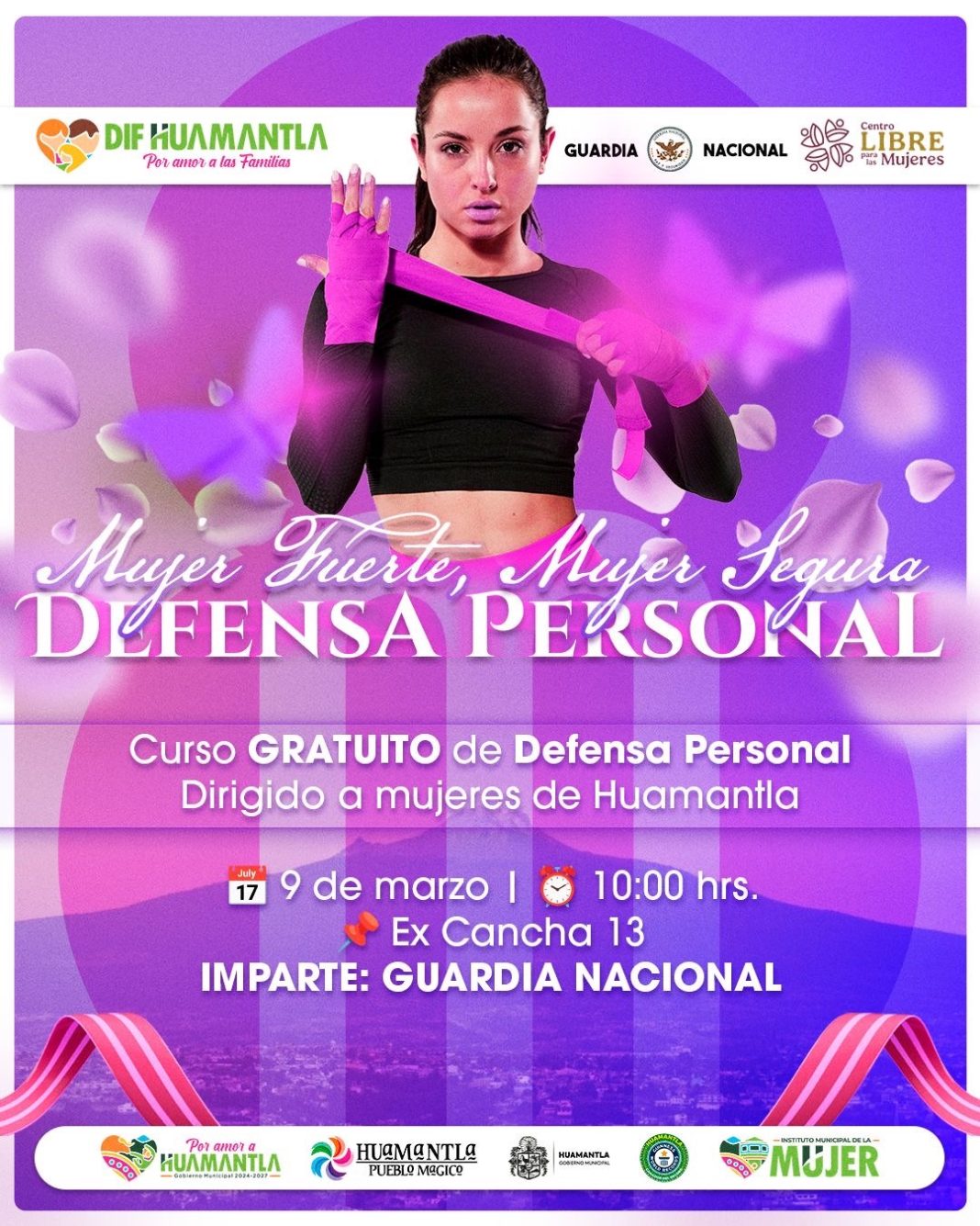 En el marco del Día Internacional de la Mujer, el Sistema Municipal DIF Huamantla, en coordinación con la Guardia Nacional, el Centro Libre de Justicia para las Mujeres Sede Huamantla y el Instituto Municipal de la Mujer, llevará a cabo el curso gratuito “Mujer Fuerte, Mujer Segura: Defensa Personal”, dirigido a mujeres de entre 18 y 60 años del municipio.