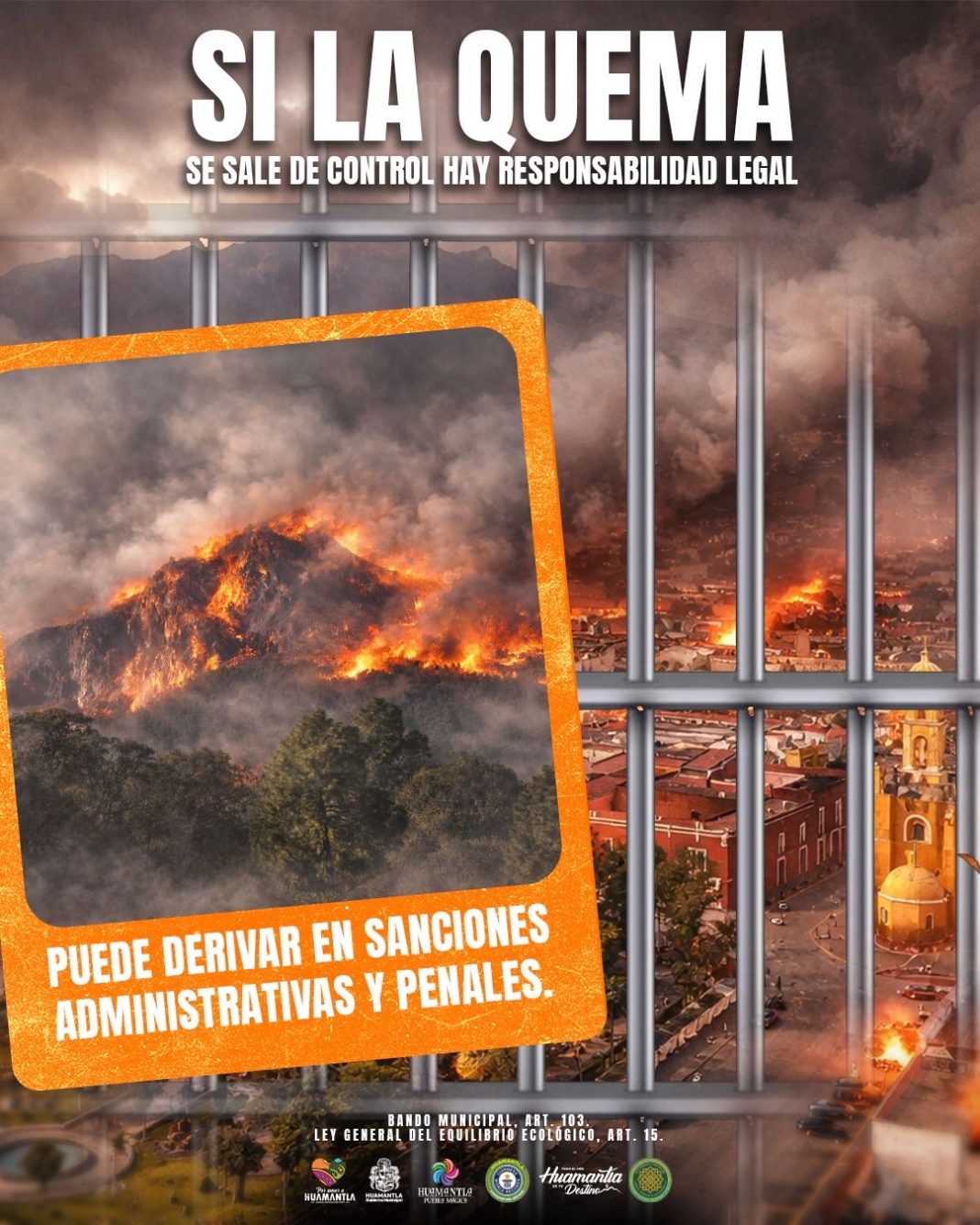 Las autoridades municipales recordaron que cuando una quema se descontrola y provoca un incendio que afecta vegetación natural, puede configurarse como un delito ambiental de carácter federal, lo que puede derivar en sanciones administrativas e incluso responsabilidades penales.