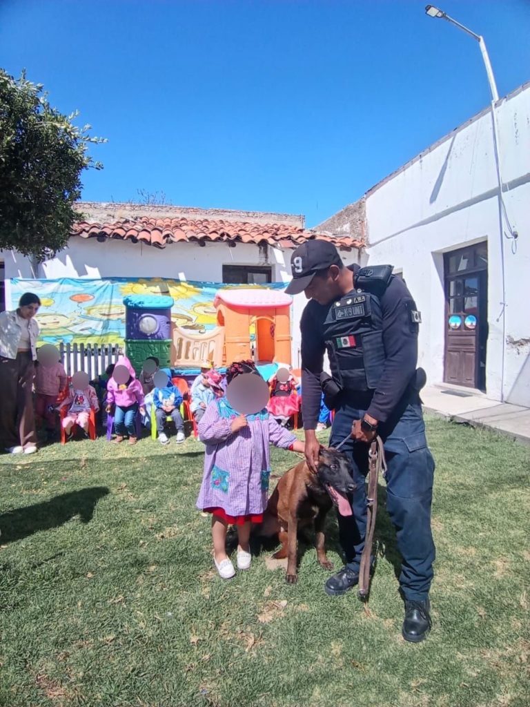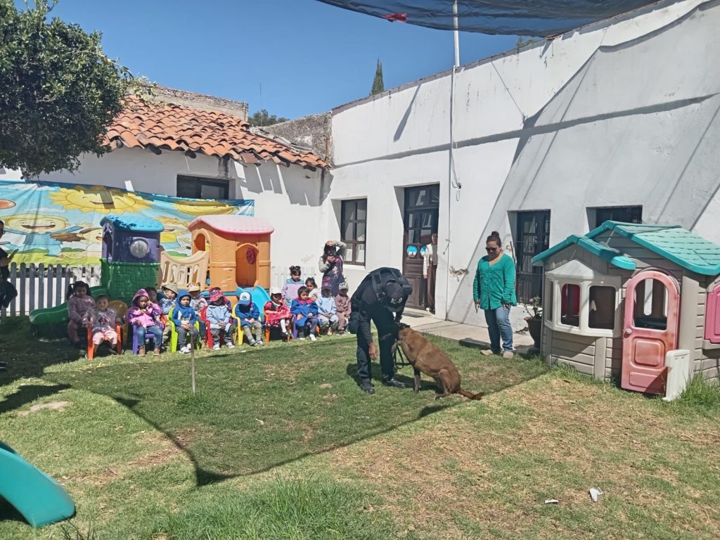 Asimismo, en el preescolar “Cajita Feliz”, se realizó una demostración del grupo K9, donde niñas y niños pudieron interactuar y conocer el trabajo de los binomios caninos, reforzando la confianza y cercanía con los cuerpos de seguridad.