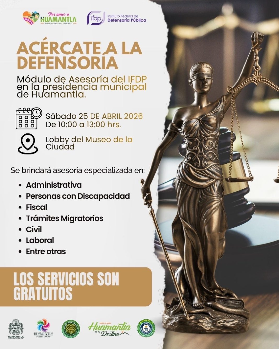 Con el propósito de fortalecer el acceso a la justicia y brindar orientación legal gratuita, el Gobierno Municipal de Huamantla, en coordinación con el Instituto Federal de Defensoría Pública (IFDP), llevará a cabo una jornada de difusión de sus servicios dirigida a la población.